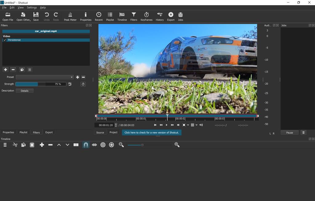 The video below shows the original video in the top left with 3 applications of the filter at strength 25%, 50% and 75%.