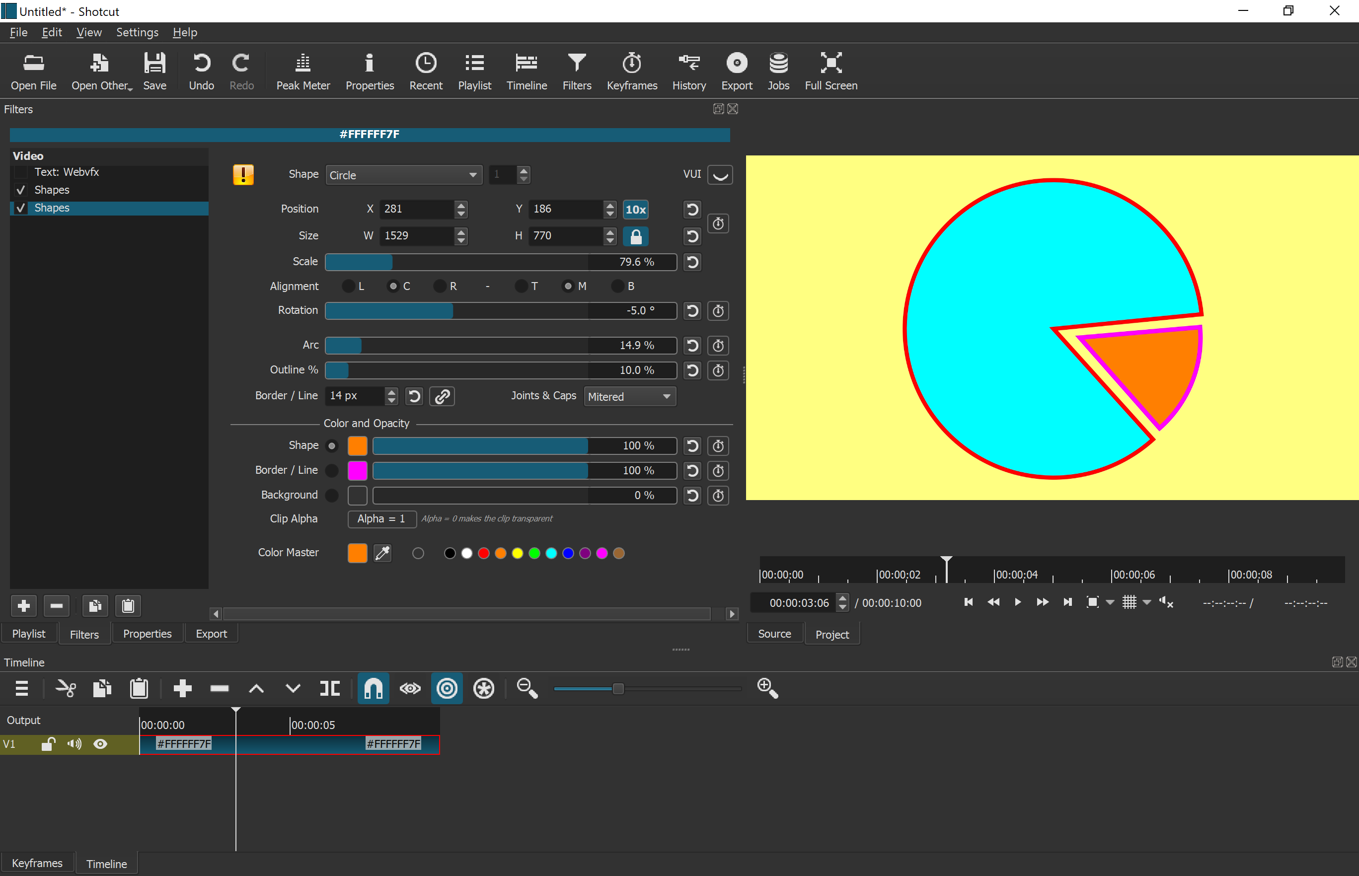 Shapes is a Shotcut Video Filter that creates shapes. The shapes are highly configurable and can have a rotation. Most of the parameters can be keyframed.