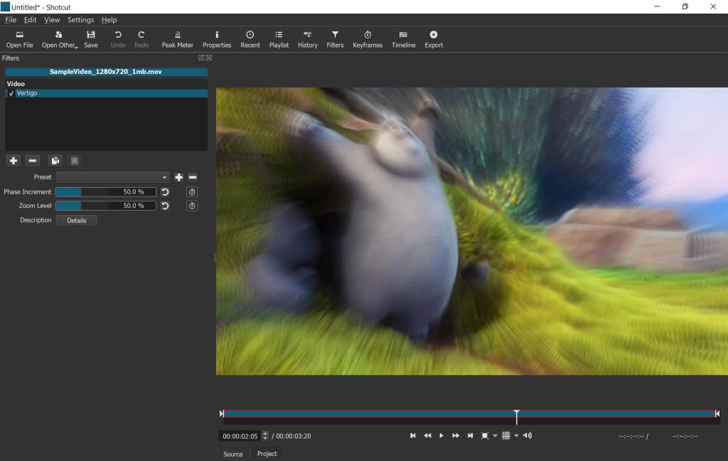 Vertigo is a Shotcut Video Filter that simulates vertigo or dizziness on behalf of the viewer. It does this using alpha blending of multiple frames of the video, these frames being rotated (or "phased") and zoomed. Both parameters can be key-framed (see the screenshot below).